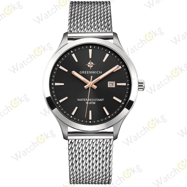 Массивный корпус часов с полированным безелем сделан из гипоаллергенной нержавеющей стали,Она обладает антимагнитным эффектом, повышая, таким образом, точность работы кварцевого механизма,Полированный циферблат черного цвета вмещает крупные часовую и минутную стрелки с покрытием из розового золота,,Хорошо читается и секундная стрелка, которая отсчитывает секунды по маркированному кругу,Индикатор в положении «3 часа» показывает дату,Надежный японский механизм обеспечивает бесперебойную работу,О качестве часов говорит повышенная водостойкость — 10 атмосфер,Модель дополняет миланский браслет из нержавеющей стали с удобной застежкой,Она легко передвигается по полотну браслета и позволяет регулировать его длину самостоятельно,Бренд Greenwich отличается вниманием к деталям,На заводной головке и задней крышке расположился логотип: стилизованное изображение розы ветров,На задней крышке — гравировка корабля, плывущего навстречу приключениям.