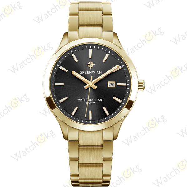 Массивный корпус часов с полированным безелем сделан из гипоаллергенной нержавеющей стали с PVD-покрытием из желтого золота,Сталь обладает антимагнитным эффектом, повышая, таким образом, точность работы кварцевого механизма,Полированный циферблат черного цвета вмещает крупные часовую и минутную стрелки,Хорошо читается и секундная стрелка, которая отсчитывает секунды по маркированному кругу,Индикатор в положении «3 часа» показывает дату,Надежный японский механизм обеспечивает бесперебойную работу,О качестве часов говорит повышенная водостойкость — 10 атмосфер,Модель дополняет браслет из нержавеющей стали с раскладывающейся застежкой,Бренд Greenwich отличается вниманием к деталям,На заводной головке и задней крышке расположился логотип: стилизованное изображение розы ветров,На задней крышке — гравировка корабля, плывущего навстречу приключениям.