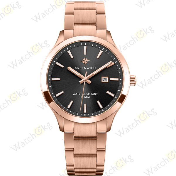 Массивный корпус часов с полированным безелем сделан из гипоаллергенной нержавеющей стали с PVD-покрытием из розового золота,Сталь обладает антимагнитным эффектом, повышая, таким образом, точность работы кварцевого механизма,Полированный циферблат черного цвета вмещает крупные часовую и минутную стрелки,Хорошо читается и секундная стрелка, которая отсчитывает секунды по маркированному кругу,Индикатор в положении «3 часа» показывает дату,Надежный японский механизм обеспечивает бесперебойную работу,О качестве часов говорит повышенная водостойкость — 10 атмосфер,Модель дополняет браслет из нержавеющей стали с раскладывающейся застежкой,Бренд Greenwich отличается вниманием к деталям,На заводной головке и задней крышке расположился логотип: стилизованное изображение розы ветров,На задней крышке — гравировка корабля, плывущего навстречу приключениям.
