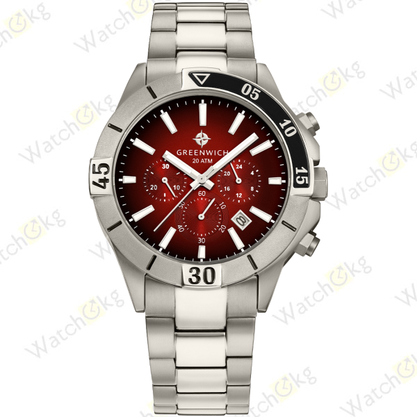 Легкость, прочность и гипоаллергенность: эти преимущества обеспечивает титан, из которого выполнены корпус и браслет кварцевых часов Greenwich серии Whale,Титановые часы действительно легче аналогичных моделей, сделанных из стали, что очень удобно для ежедневного использования,Титан идеально подходит для частых контактов с кожей запястья, так как практически не вызывает аллергических реакций,Корпус часов Whale довольно массивный, его диаметр равен 44 мм, в конструкции предусмотрена защита для рельефной заводной головки,На поворотный безель вынесена дополнительная шкала с выделенным сегментом 0-15 секунд, Красный матовый циферблат, защищенный минеральным стеклом, включает накладные риски и центральные стрелки, покрытые специальным люминесцентным составом, три дополнительных индикатора, выделенных визуально полировкой в виде солнечных лучей, и окошко даты,Засекать время в минутах и секундах можно с помощью кнопок хронографа, вынесенных на боковую часть корпуса,Повышенная водостойкость хронографа составляет 20 атмосфер,Это говорит о том, что часы можно оставить на запястье, даже если вы собираетесь плавать или погружаться с маской,Часы Whale – это стильный и функциональный аксессуар,Дымчато-серый цвет, характерный для титана, подчеркивает его универсальность, Часы хорошо подойдут практически под любой выбранный вами образ, от спортивного, до расслабленного casual.